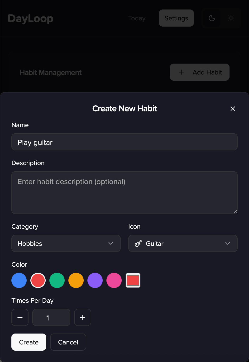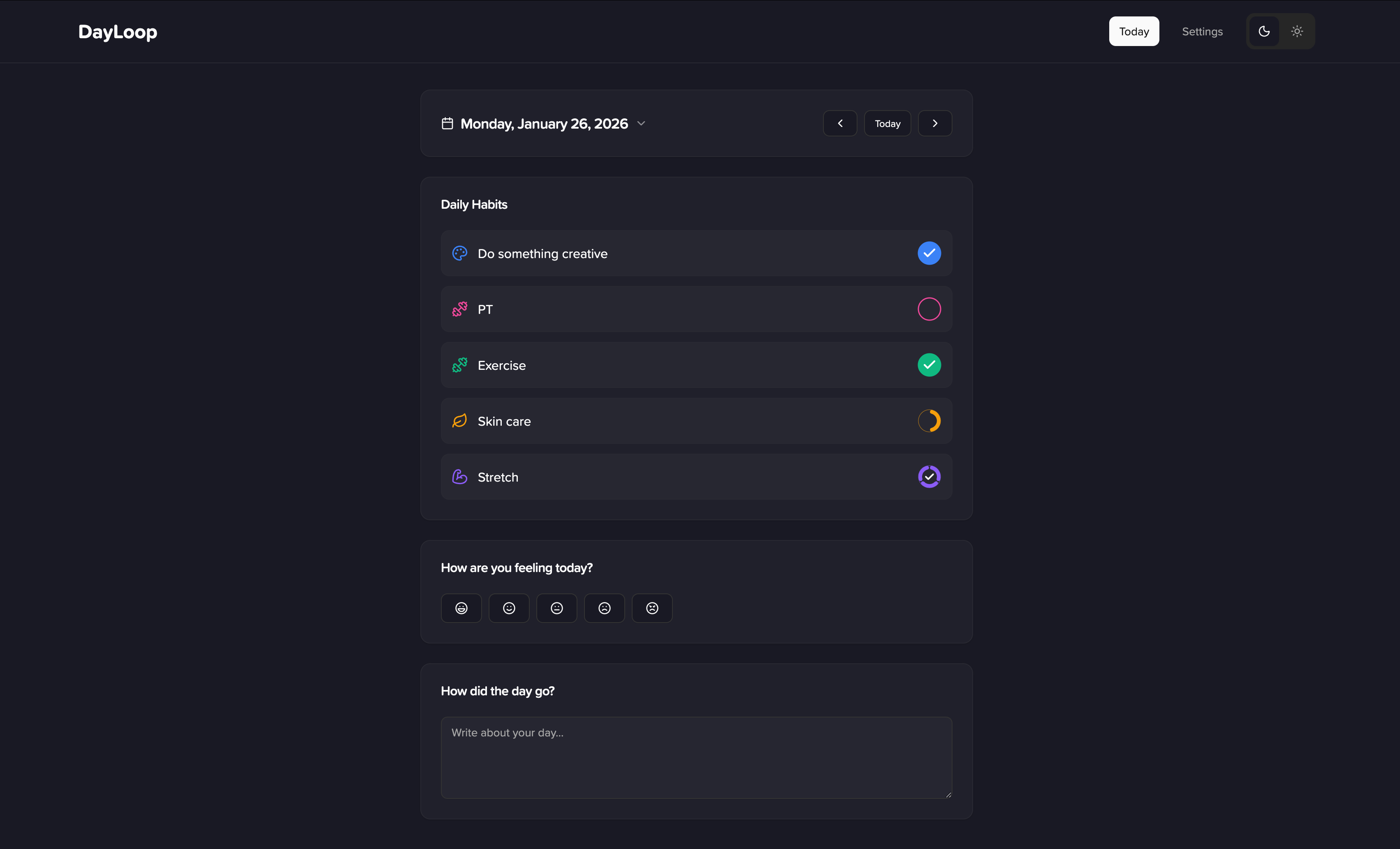 None of the many habit tracking apps I've tried work exactly the way I want, so I used Cursor to build my own. The app uses React, Vite, Tailwind CSS, and shadcn/ui. It's fully responsive and supports both light and dark modes; I integrated Lucide icons to represent the habits.