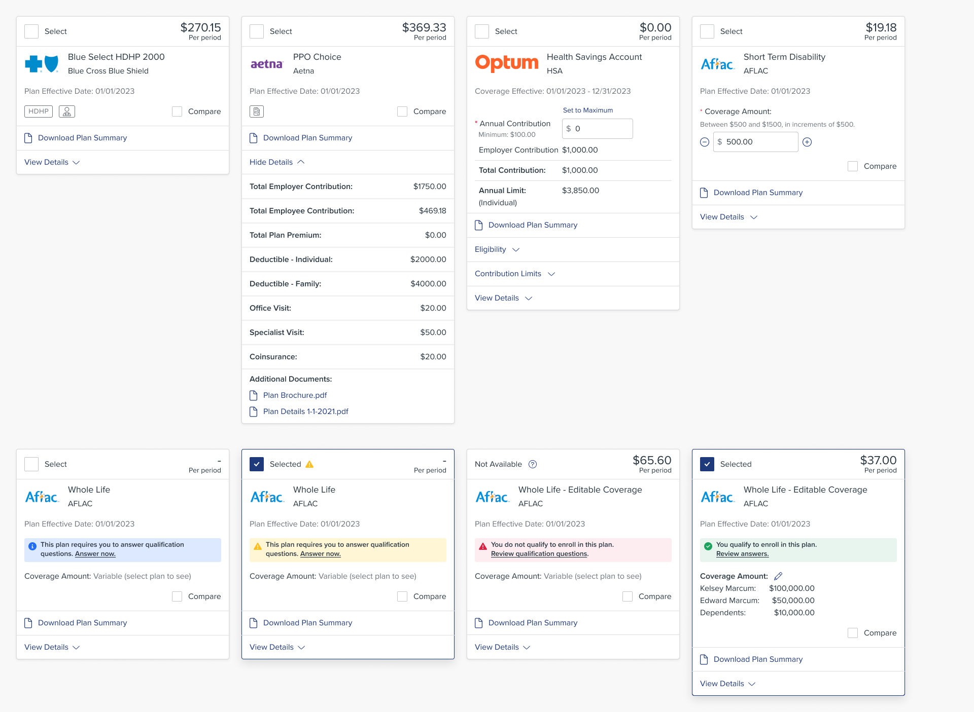 The core of the benefits enrollment workflow is the benefit card, with each card representing a benefit plan employees can select. My analysis identified six core types of cards, each with several distinct variations depending on plan configuration.