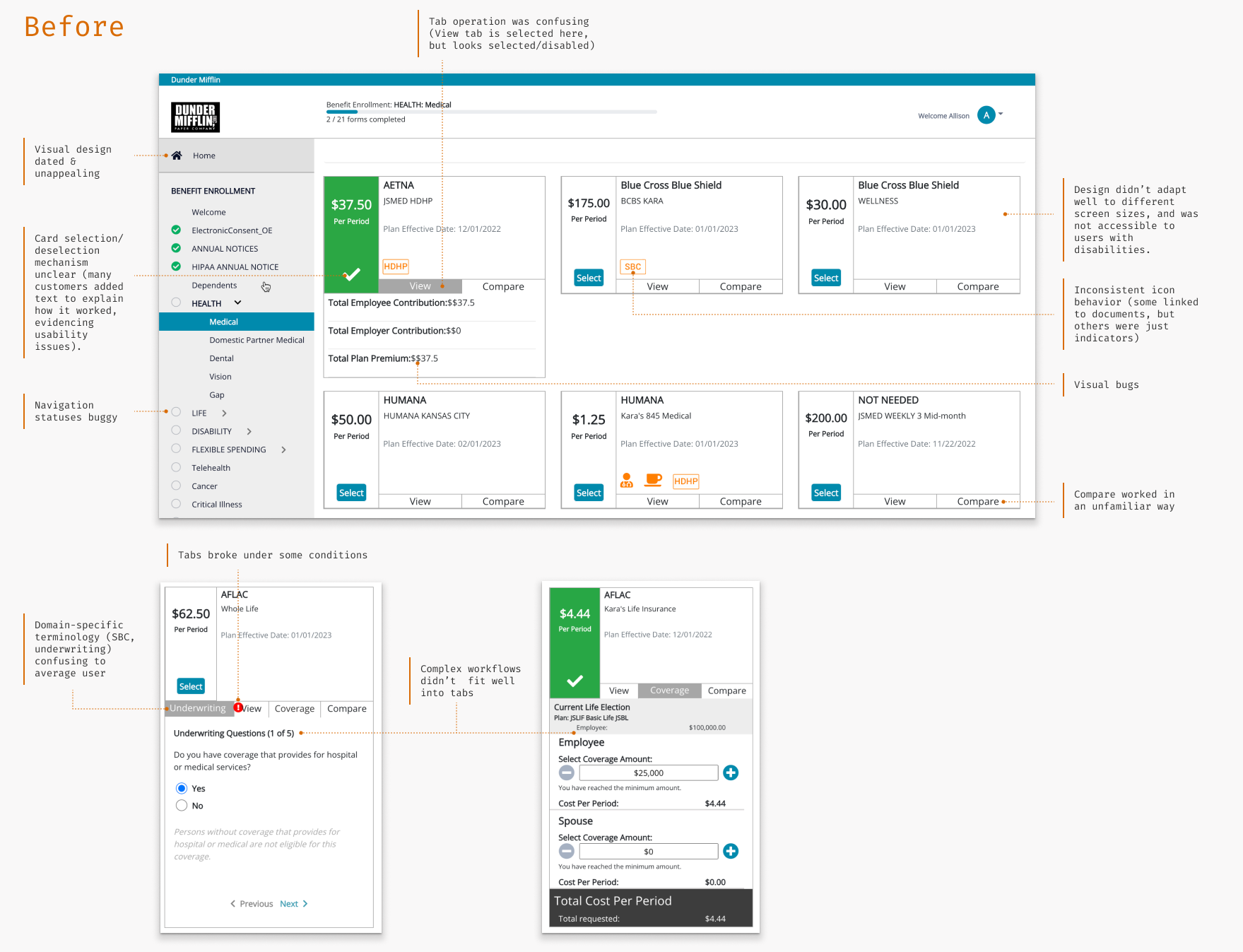 I did a thorough analysis of the overall user journey and the BE application in particular. The journey-level challenges are covered in the Unified Employee Experience Case Study. I also identified many pain points in the Benefits Enrollment UI: