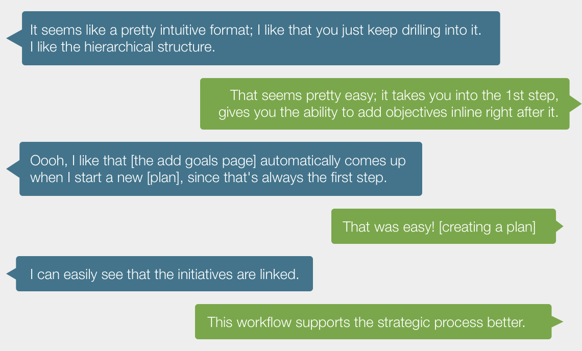 One key goal of the redesign was to help the user form the correct mental model of the relationship between strategic plan elements. We also wanted to make it as easy as possible to enter data on a touch device.