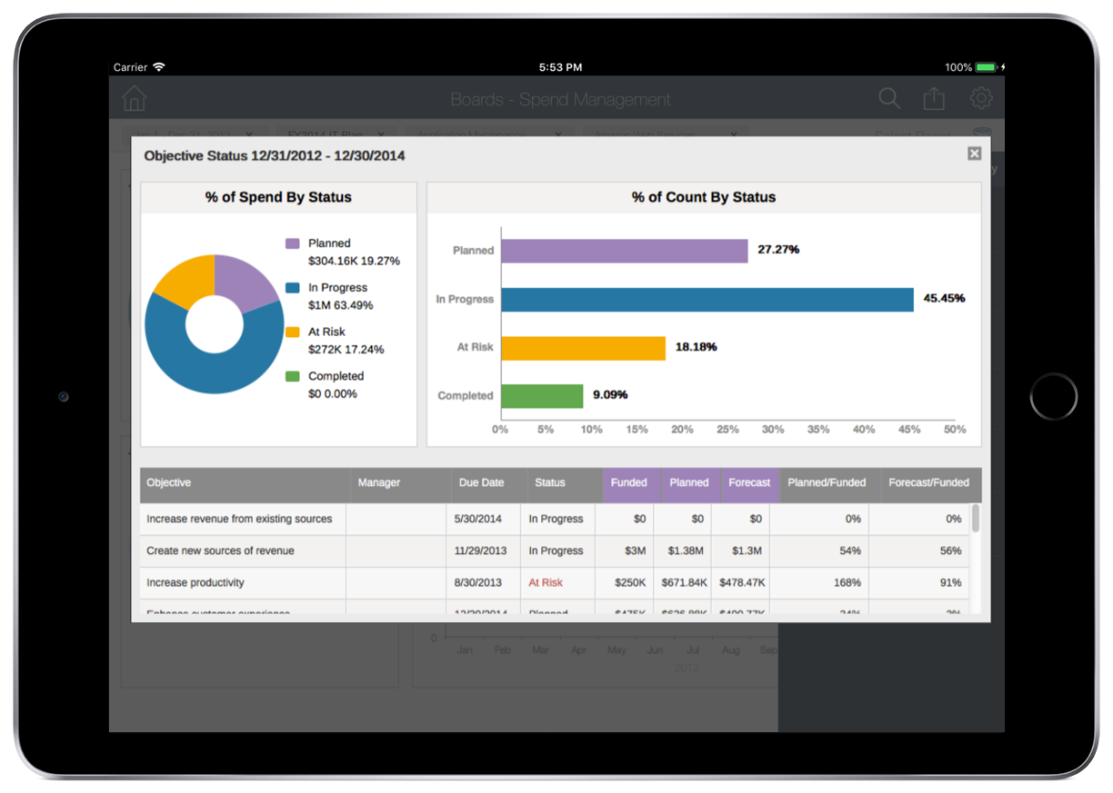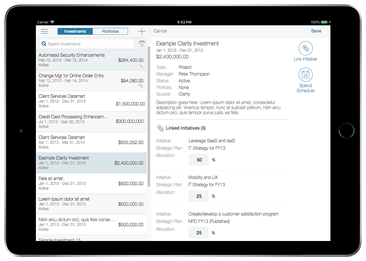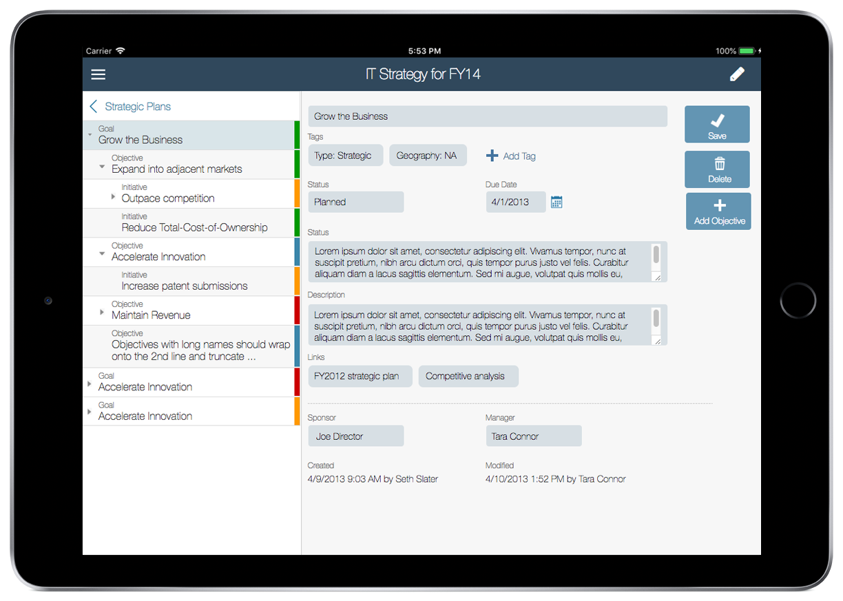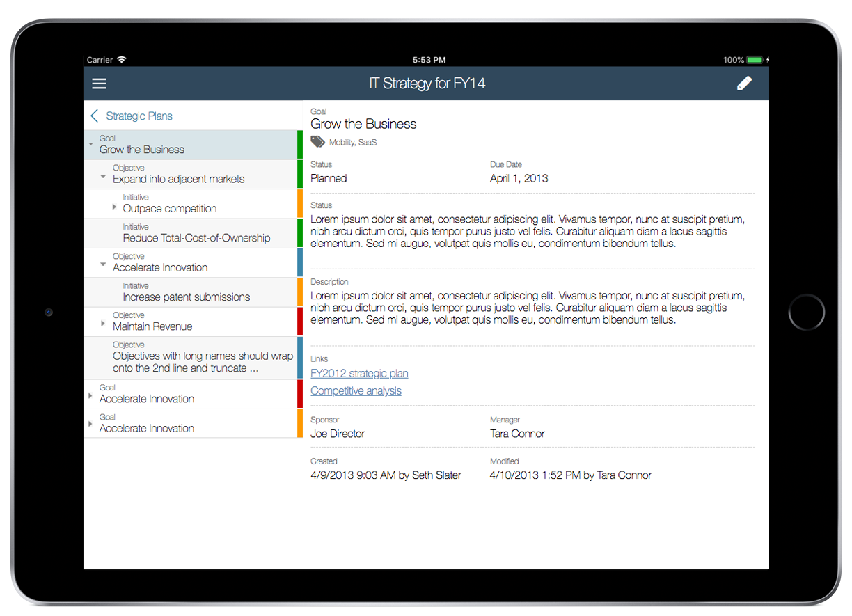 CA already had a product, Clarity PPM, that tracked programs and projects at a very detailed level (a.k.a. "bottom-up planning"). They wanted to create an app that would support strategic ("top down") planning, and integrate it with Clarity to allow the large existing customer base to see how individual projects contributed to the organization's strategic goals.
